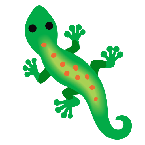 A lizard, a scaly reptile with a long tail. Depicted as a light-green lizard on all fours from above, generally looking left with large eyes, a lightly textured or colored back, and toes outspread, as a gecko. May be used for a variety of wild and pet lizards. Google’s lizard was previously brown.