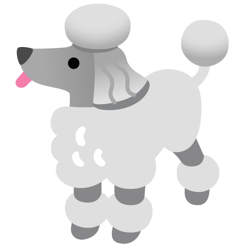 A poodle, a popular dog breed with curly hair, often groomed in an ornamental pattern. Generally depicted as a grayish-white poodle in full profile on all fours facing left, with a shaved torso, legs, and face with fuller, pom-pom-like hair on its head, ears, chest, feet, and tip of tail (as the Continental Clip). Like 🐕 Dog, may be used to represent a variety of dog breeds (often fluffy or long-haired). See also 🐶 Dog Face. Google, Samsung, and Facebook’s designs previously featured pink poodles.