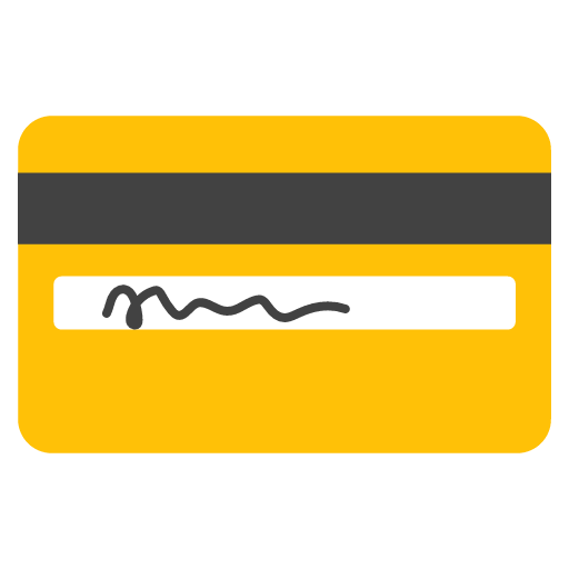 The backside of a credit card, showing the magnetic strip and signature. Color and detail vary across platforms, but often shown as gold, silver, or blue. May be used for banking and other ID cards as well for various content concerning money, including payment. Some vendors feature easter eggs: Apple’s design features John Appleseed in the signature and a security code of 448 and Facebook’s design features founder Mark Zuckerberg’s signature and a security code of 123. Samsung’s design previously included the initials KJH.