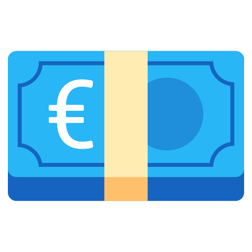 A banded stack of euro banknotes, the paper currency of the European Union (EU). Color and detail vary across platforms, but shown with the euro sign, €. Commonly used for various content concerning wealth and money, not restricted to the EU. Some vendors, including Apple and Samsung, depict green €100 bills; others, including Google, WhatsApp, and Facebook, depict blue €20 bills. Facebook additionally features the EU flag.