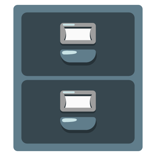 A metal filing cabinet, as used to organize and store file folders at an office. Depicted in black or gray with two drawers, handles, and label holders. Commonly used for various content concerning paper or computer files; filing and organization; various types of data, information, and archives; and office work. Google’s design was previously blue, Facebook’s had its bottom drawer open.