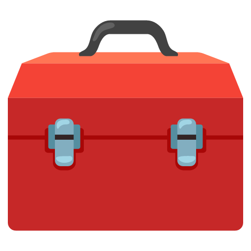 A red box for holding and transporting tools, such as a hammer and wrench. Generally depicted as latched shut with silver hardware and a black handle. Commonly used for literal or metaphorical tools, toolkits, and building. WhatsApp's design includes a hammer in front. Google’s design was previously shown as open with two wrenches and a pair of pliers.