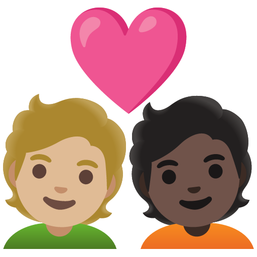 It represents a couple in love with medium-light and dark skin tones.