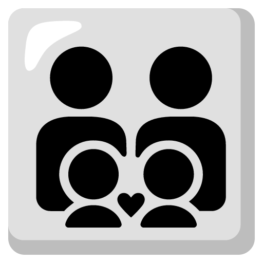 A family unit shown with two adults and two children. Usually depicted as a collection of silhouettes on a block color background, as per Unicode's recommendations. The Family: Adult, Adult, Child, Child emoji is a ZWJ sequence combining 🧑 Person, Zero Width Joiner and 🧒 Child. These display as a single emoji on supported platforms.