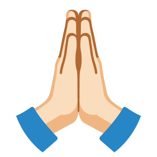 You can add the folded hands: light skin tone emoji to your website in a few ways. The first way is by using the unicode character, the emoji itself. This has the advantage of rendering immediately and it doesn't require any additional network requests. However, emoji characters don't always scale well and they are inconsistent across platforms.