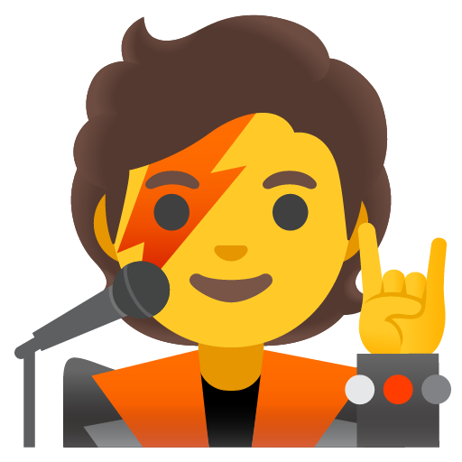 A singer or rock star generally displayed with a microphone, and sometimes musical notes. iOS and Android display this emoji as a Bowie-esque figure while WhatsApp appears heavily inspired by Prince. The Singer emoji is a ZWJ sequence combining π§ Person, Zero Width Joiner and π€ Microphone. These display as a single emoji on supported platforms.