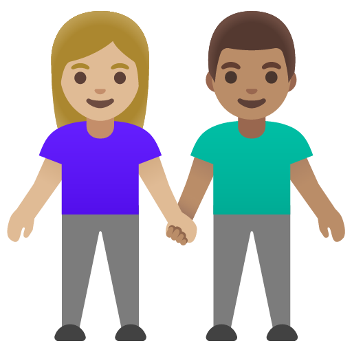 You can add the woman and man holding hands: medium-light skin tone, medium skin tone emoji to your website in a few ways. The first way is by using the unicode character, the emoji itself. This has the advantage of rendering immediately and it doesn't require any additional network requests. However, emoji characters don't always scale well and they are inconsistent across platforms.