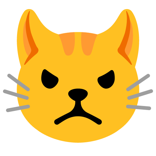A cartoon cat variant of 😡 Pouting Face. Also resembles 😠 Angry Face. Depicted as yellow on major platforms. Sometimes used to represent the internet meme and celebrity Grumpy Cat. Apple’s design previously displayed the face in profile, as did Twitter's. Microsoft's design previously more closely resembled the 😟 Worried Face than the 😠 Angry Face.